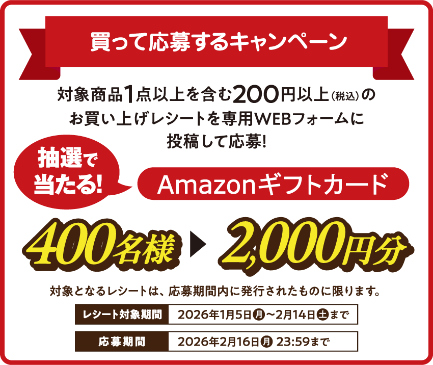 - ご応募には「購入日時・購入商品名・購入個数・購入店名」が確認できるレシート等の購買証明が必要です。