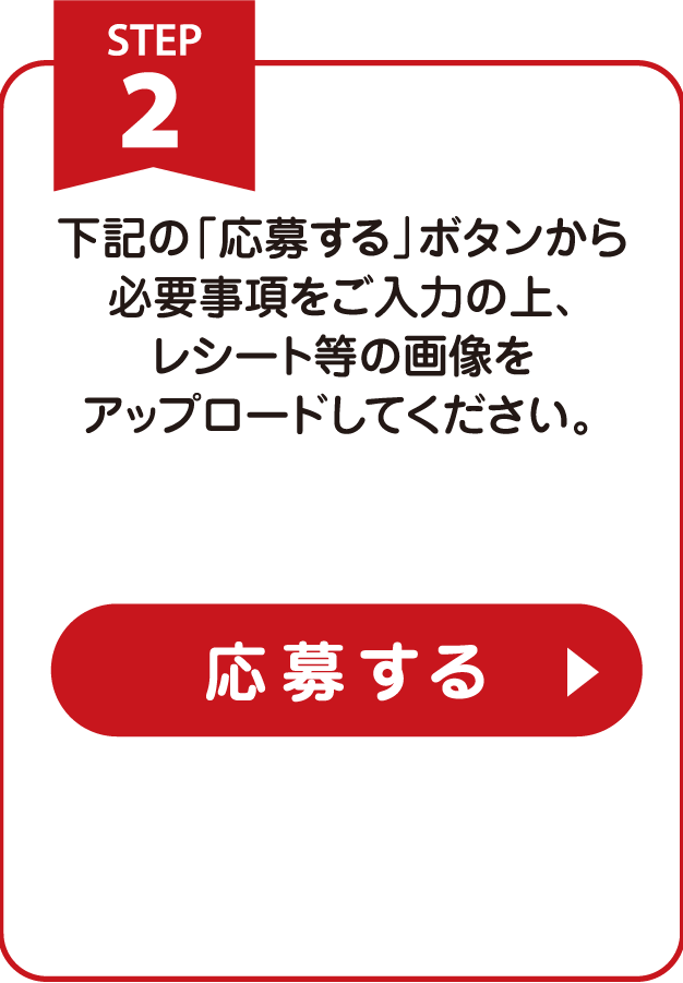 - 応募資格を満たす購買証明(レシート・領収書・納品書・購入画面)を撮影した画像をご用意ください。